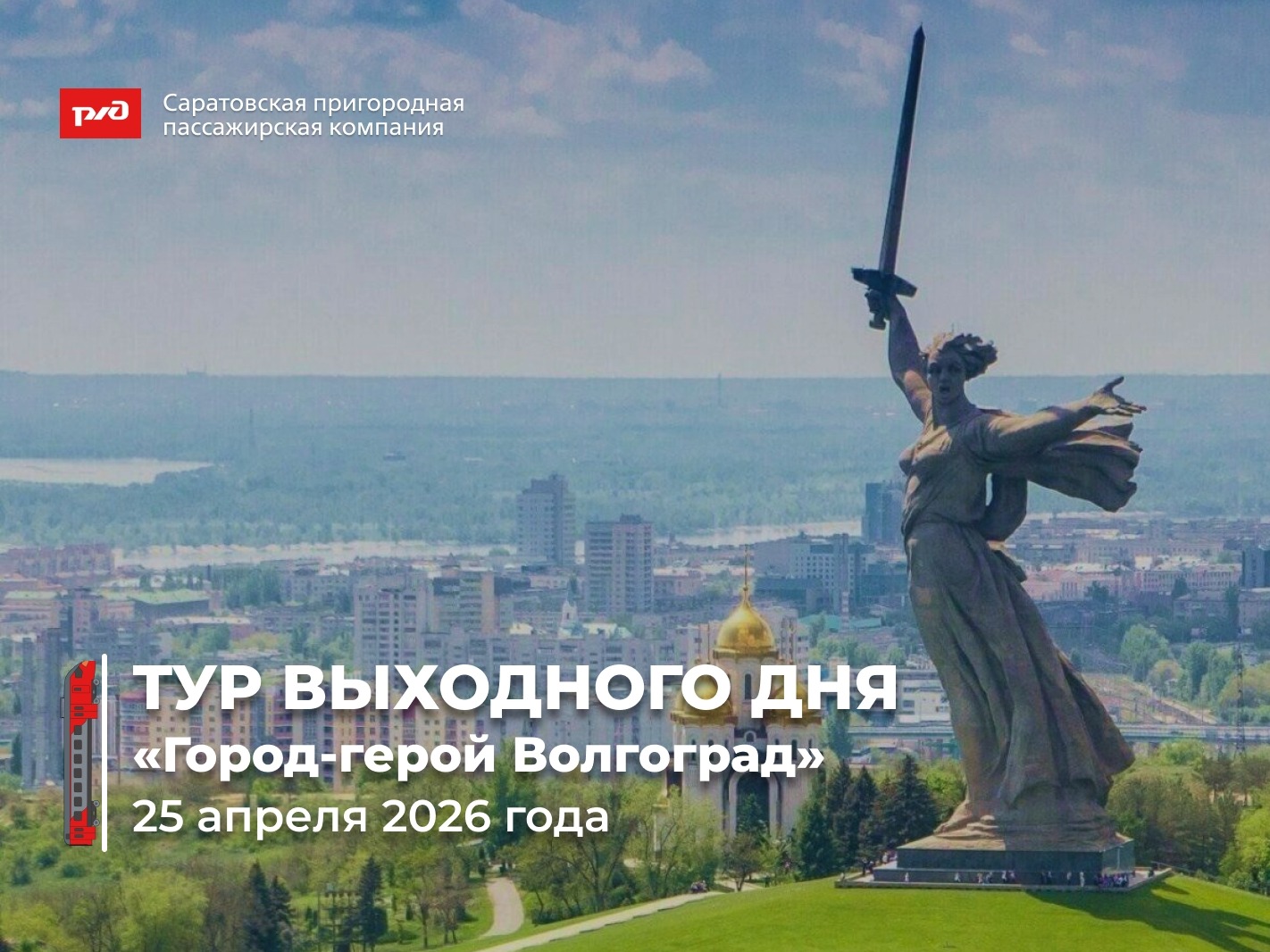 Отправляйтесь в незабываемое путешествие 25 апреля 2026 года на электропоезде и прикоснитесь к истории города-героя. Всего пять часов в пути и вы окажетесь в самом сердце Волгограда, где вас ждет насыщенная